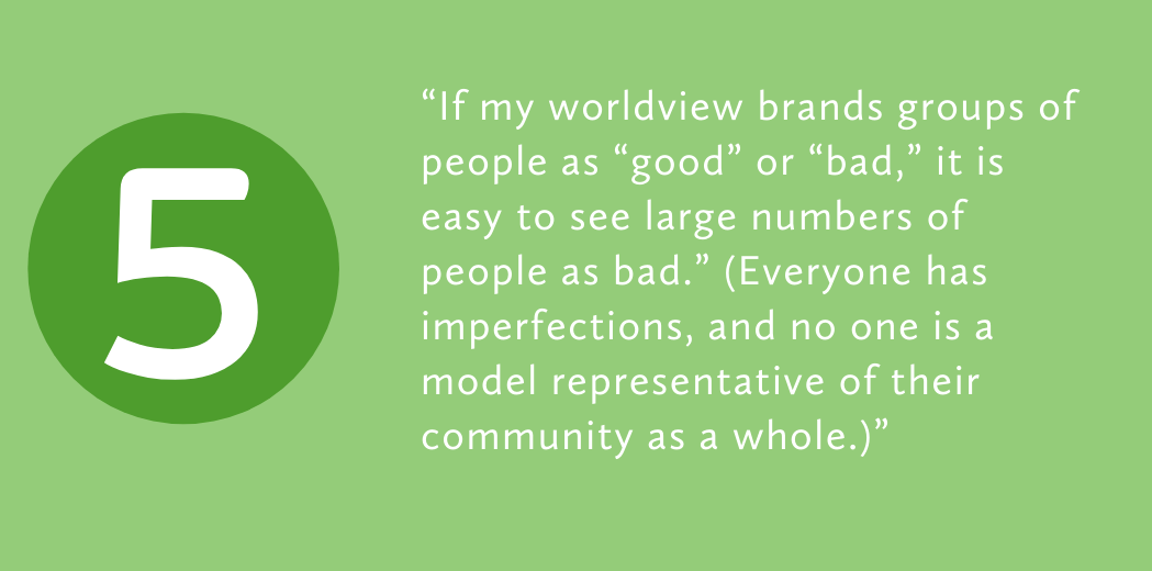 For many, it is difficult to draw the line between unhealthy stereotyping and a healthy understanding of the shared experiences of a group of people. Lived experience with diverse people and ideas is the best way to understand differences. A mindset of group homogeneity, even with a “positive stereotype,” can easily become bigotry.